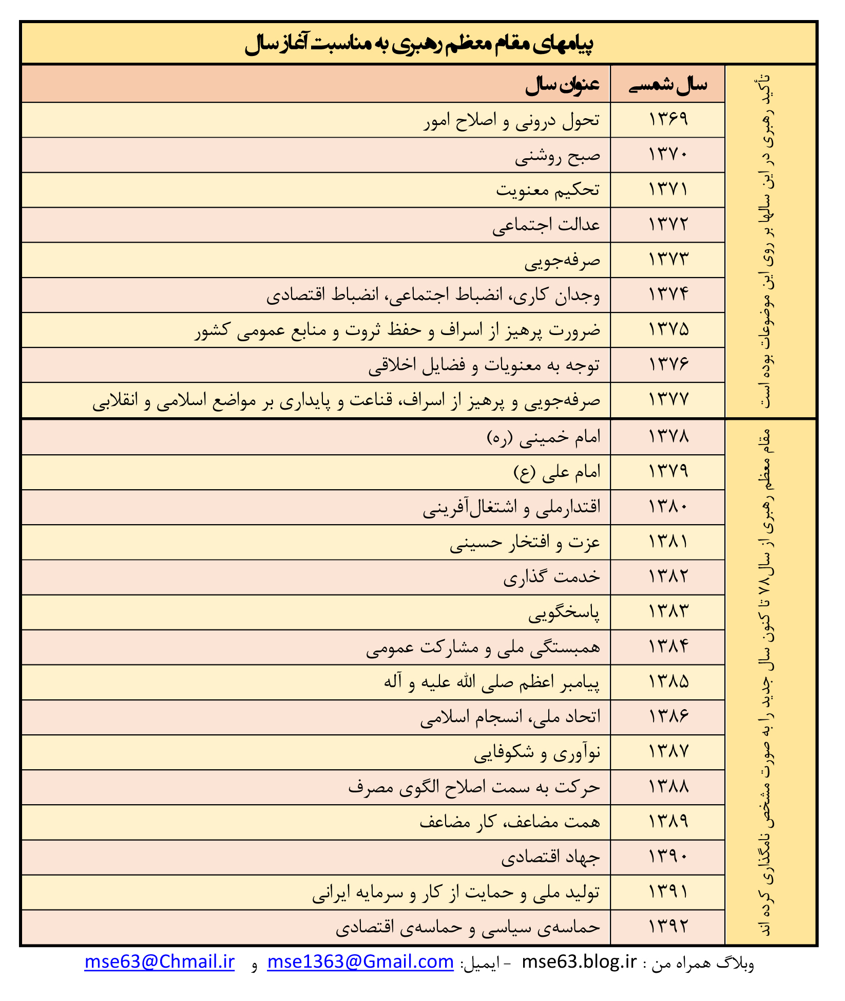 رهبر معظم انقلاب به عنوان بالاترین رکن نظام جمهوری اسلامی ایران از پس از سال 68 که به عنوان رهبر نظام اسلامی انتخاب گردید؛رویکردهای مهم کشور را در پیامهای نوروزی در آغاز سال جدید مطرح فرموده اند. از سالهای 69 تا 78 بر پیامهایی تأکید فرمودهاند که در جدولی در ادامه مطلب خواهید دید. ایشان از سال78 تا کنون به صورت مشخص سالهای شمسی را طی پیامی در آغاز سال نامگذاری کردهاند. این نامها بر اساس شرایط و اوضاع کشور صورت گرفته است.