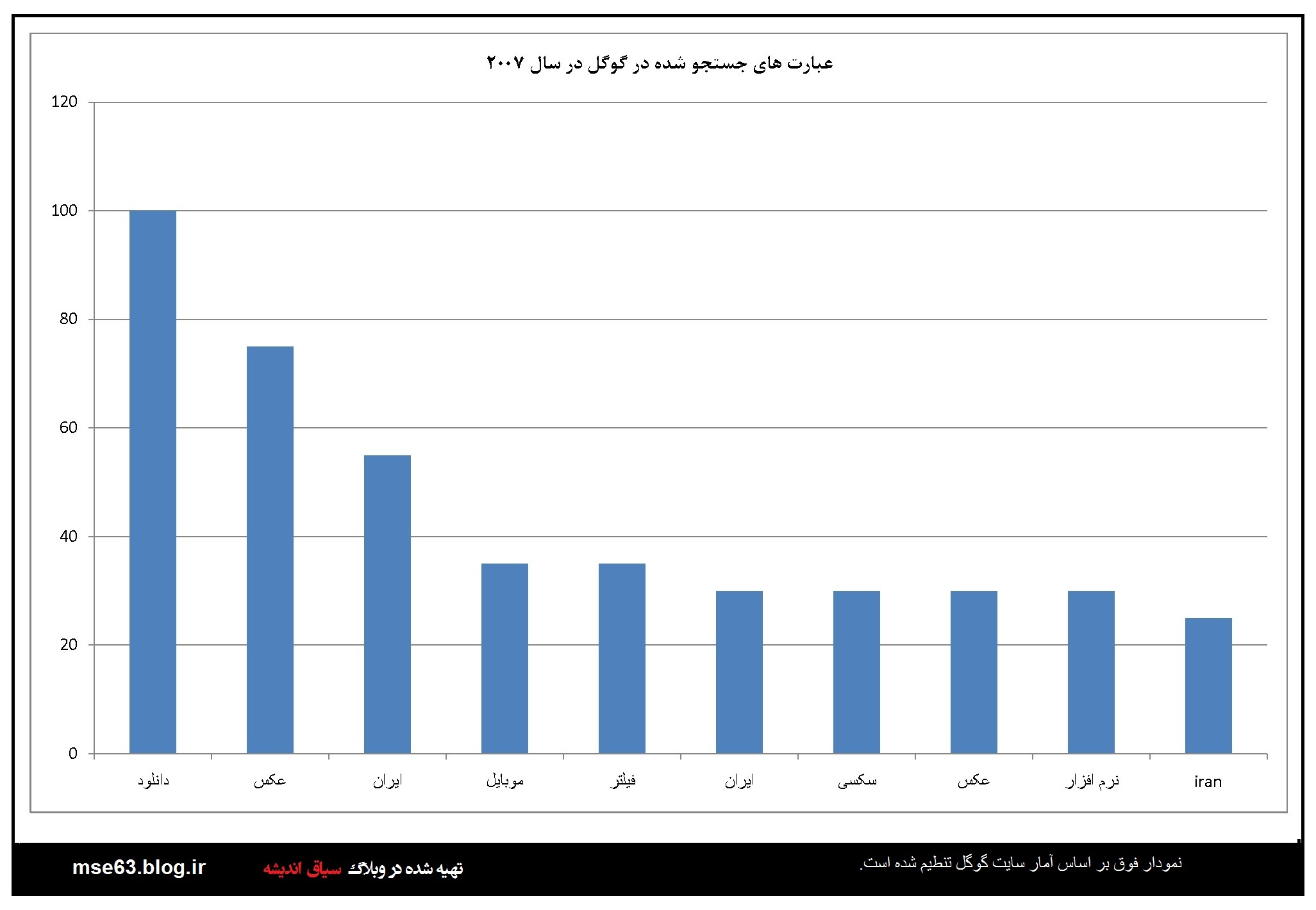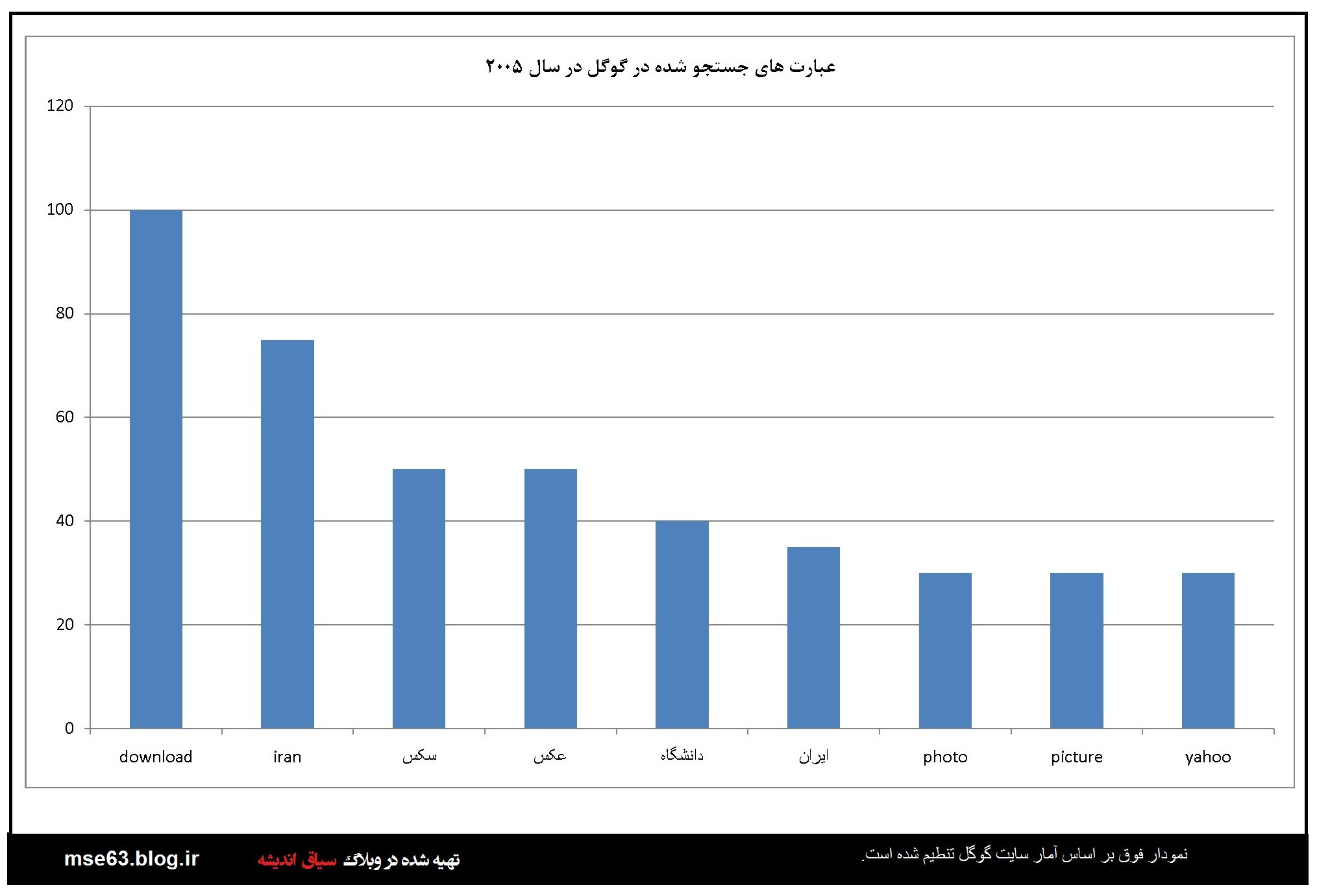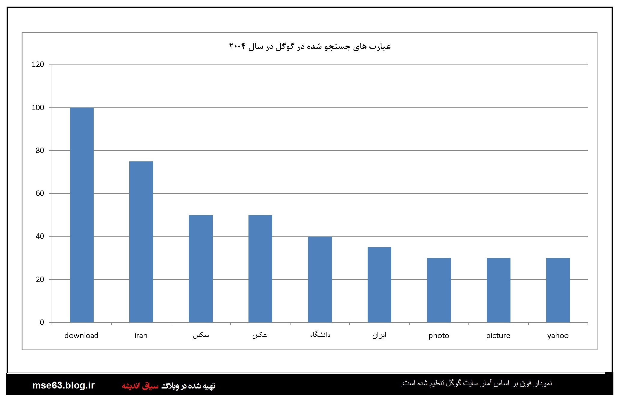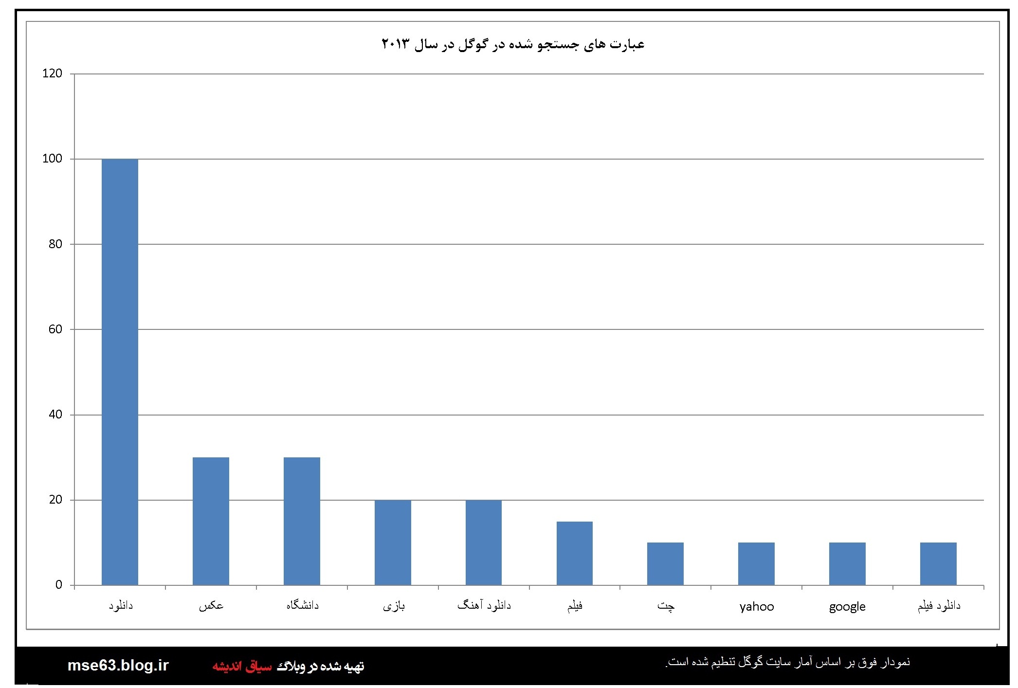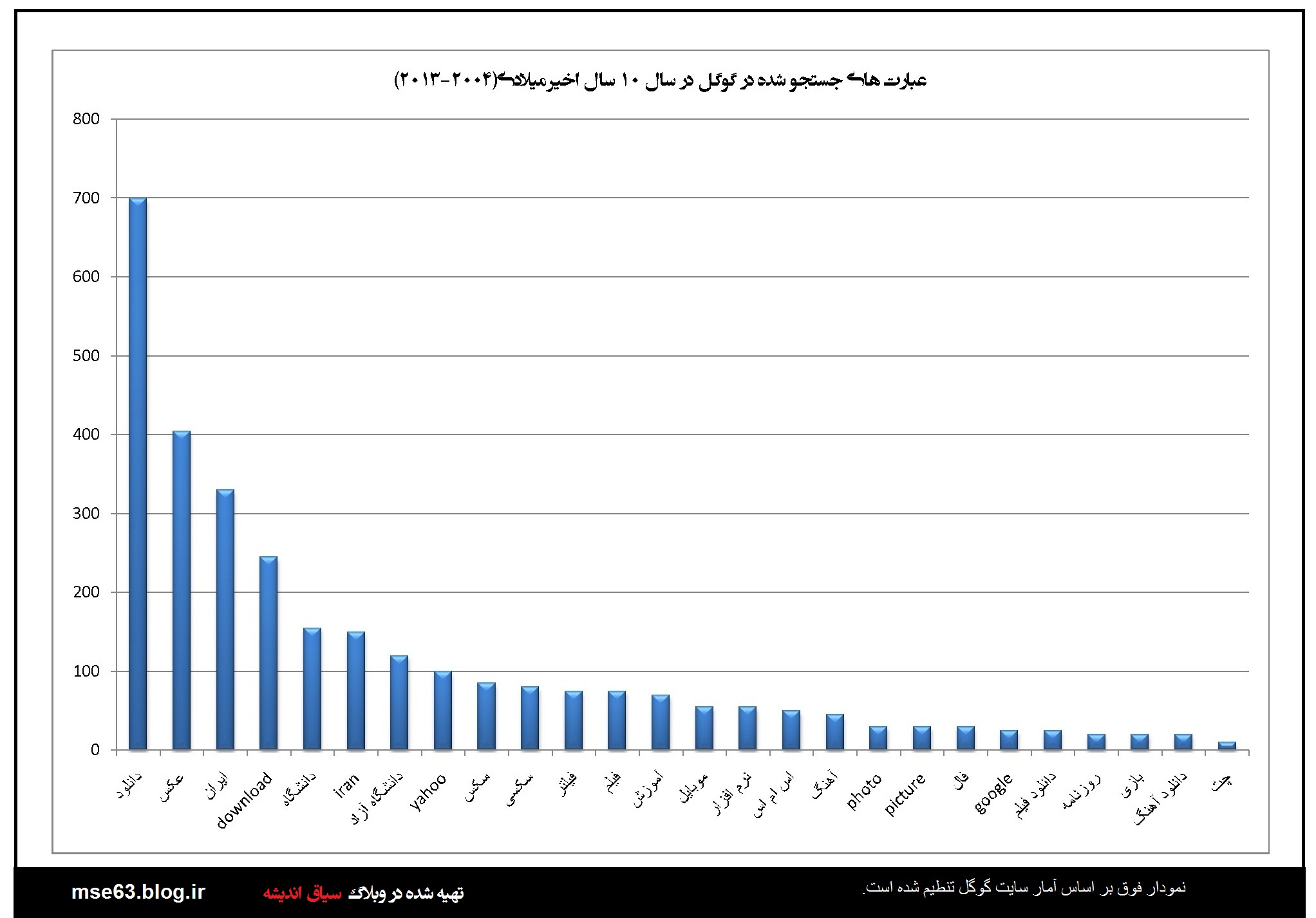 گوگل در هر سال آمار جستجو ها توسط کاربران را به تفکیک کشورها ارائه می دهد. در این قسمت با استفاده از اعداد و آرقامی که در آمارگیری گوگل از کاربران ایرانی در سالهای مختلف ارائه شده نمودارهایی ترسیم شده است که آگاهی از آنها برای ما ایرانیان خالی لطف نیست. با فرض صحت اطلاعات گوکل می توان از این آمارها در بررسی های علمی استفاده کرد. البته گوگل و شرکت هایی از این دست همیشه دستخوش سیاست گذاری های دولتمردانشان بوده اند و گاه نتوانستند بغض خود را نسبت به ایران اسلامی مخفی کنند. اما در این بخش بنا را بر صحت اطلاعات می گذاریم.این آمار و نمودارها از سال 2004 نا 2013 است.