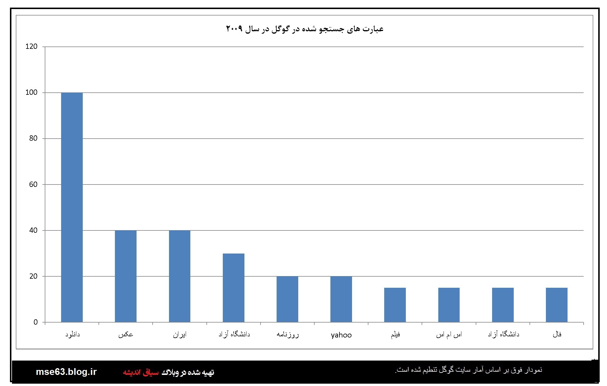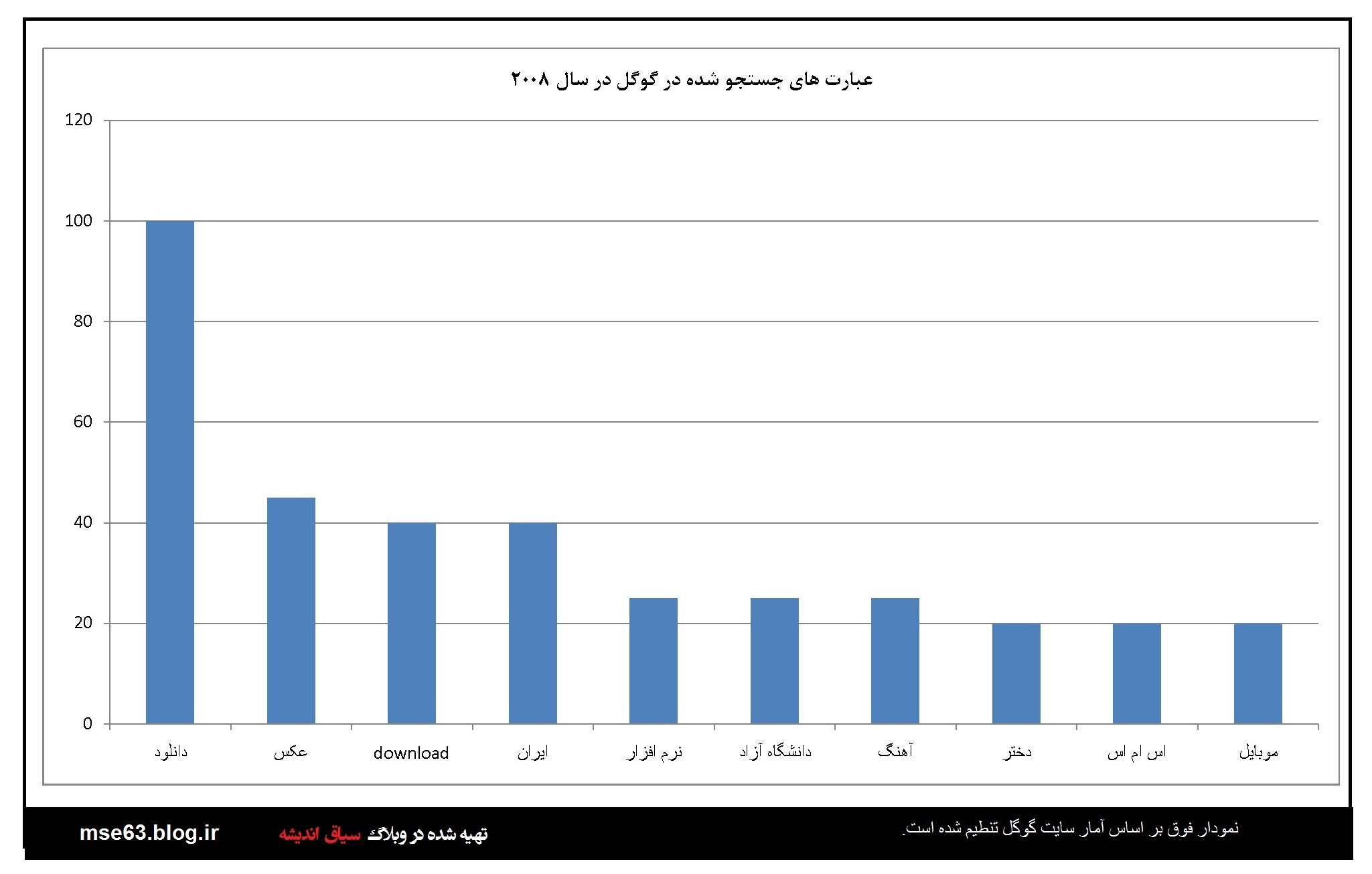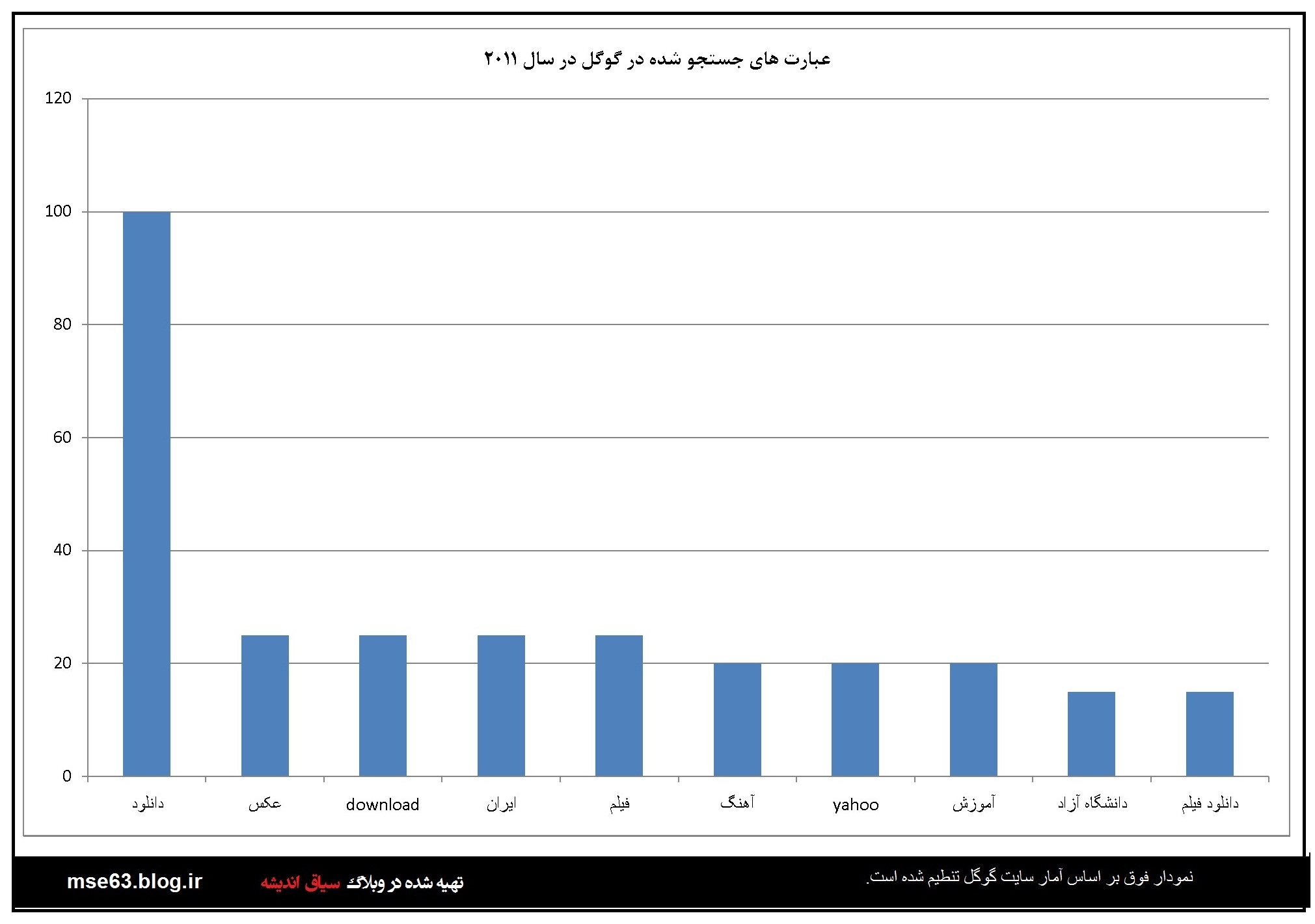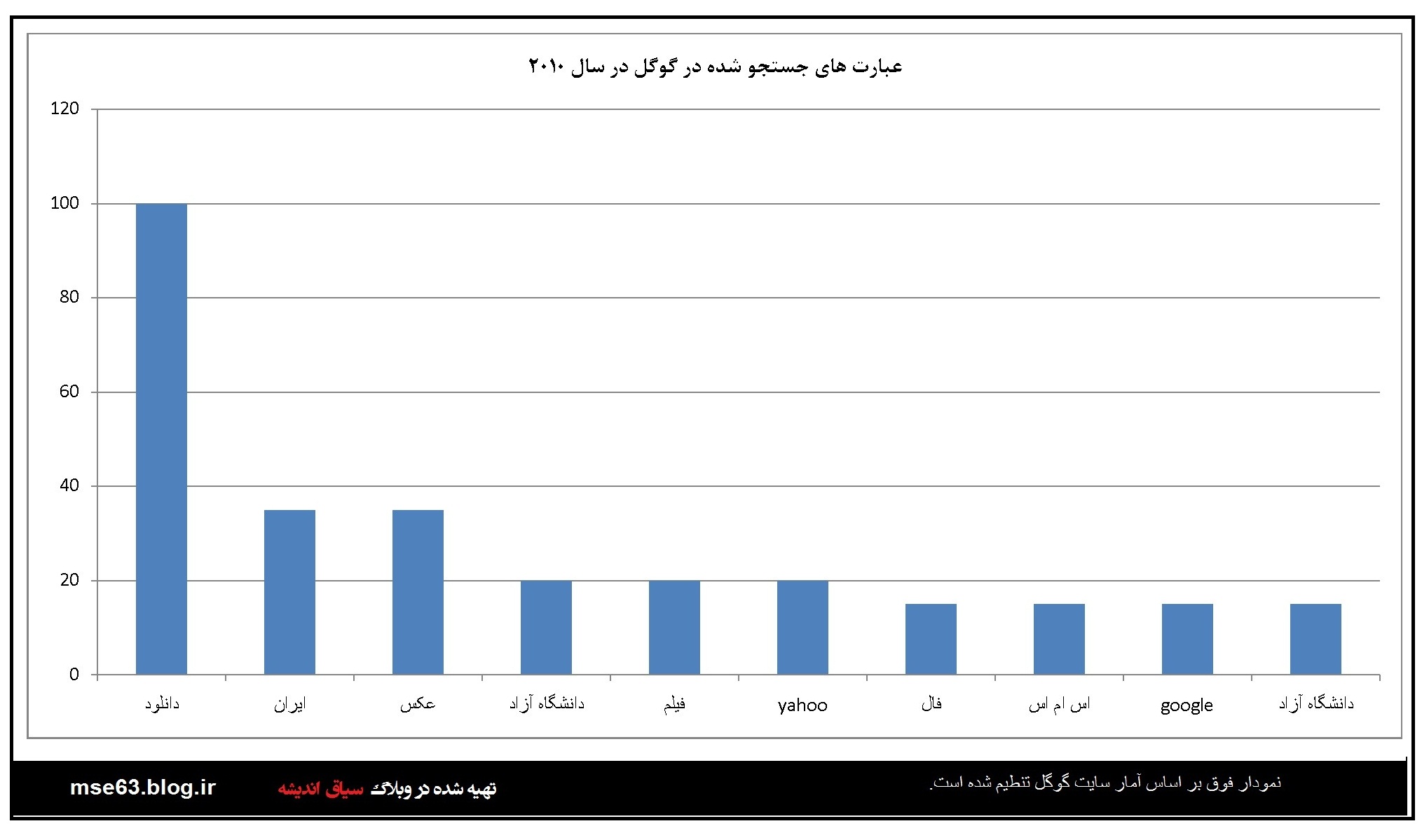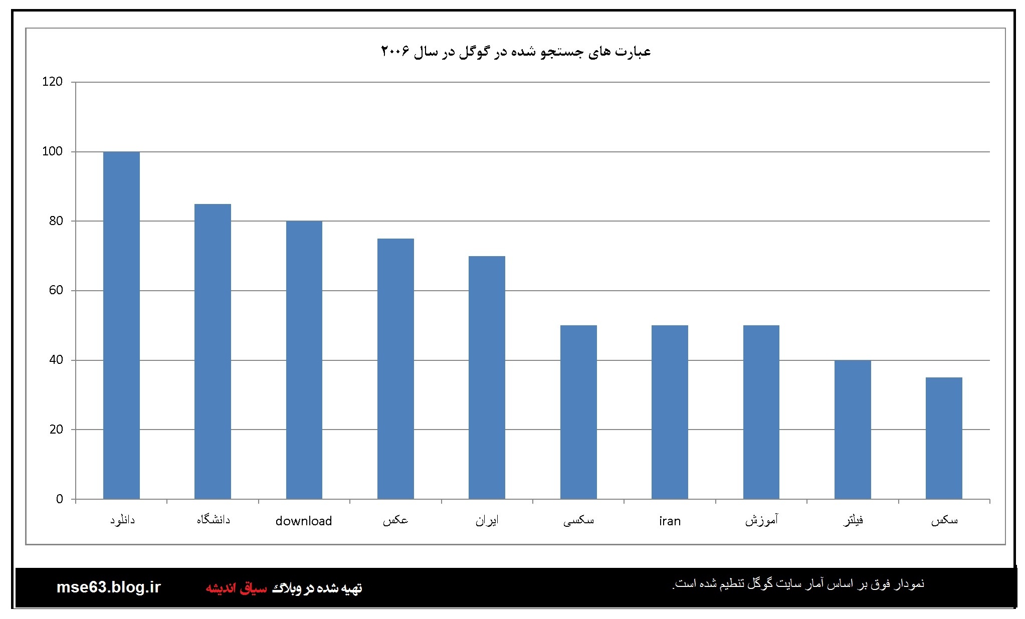 گوگل در هر سال آمار جستجو ها توسط کاربران را به تفکیک کشورها ارائه می دهد. در این قسمت با استفاده از اعداد و آرقامی که در آمارگیری گوگل از کاربران ایرانی در سالهای مختلف ارائه شده نمودارهایی ترسیم شده است که آگاهی از آنها برای ما ایرانیان خالی لطف نیست. با فرض صحت اطلاعات گوکل می توان از این آمارها در بررسی های علمی استفاده کرد. البته گوگل و شرکت هایی از این دست همیشه دستخوش سیاست گذاری های دولتمردانشان بوده اند و گاه نتوانستند بغض خود را نسبت به ایران اسلامی مخفی کنند. اما در این بخش بنا را بر صحت اطلاعات می گذاریم.این آمار و نمودارها از سال 2004 نا 2013 است.