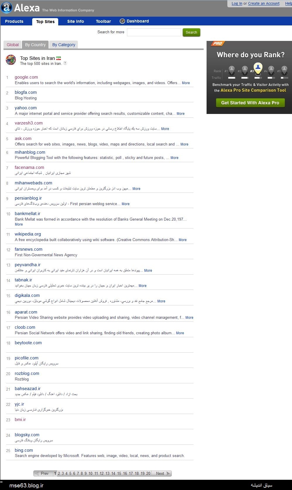در این قسمت 25 سایت پربازدید در ایران را به نقل از سایت آلکسا مشخص شده است. البته این آمار مربوط به92/11/8 است.تصویر آن را در ادامه مطلب می توانید ببینید.